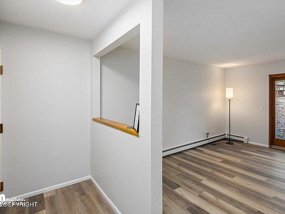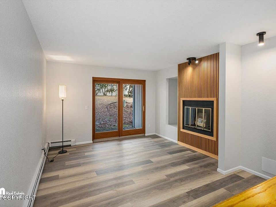 Tastefully updated and move-in ready! This desirable bottom corner unit at Alaska Landing Condominiums features 2 bedrooms and 2 bathrooms with thoughtful upgrades throughout. Highlights include brand-new bathrooms, luxury vinyl plank flooring, fresh interior paint, modern lighting, and newer stainless steel appliances. Recent improvements also include a brand-new boiler and all new plumbing ballvalves for peace of mind. The cozy real wood-burning fireplace creates the perfect focal point for relaxing evenings. Enjoy the convenience of your own single-car garage, ideal for Alaskan winters. Conveniently located near the community entrance, this unit offers easy access while maintaining privacy. Step out through the back sliding glass door to enjoy the peaceful rear courtyard.