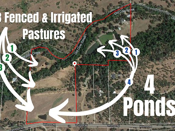 WATER, WATER, WATER!!! Over 30 acres -private & gated! 2,000 of Cow Creek Frontage! 1100 GPM Water Rights! Plus 4 Ponds. 3 Fenced & Irrigate Pastures! Permitted Ag Pump & Cistern, large diesel water pump, irrigation piping, 300 gallon tank for Ag diesel, cattle squeeze, feeders, holding pen, multiple outbuildings, 4 chicken houses w water/power, silo for feed, RV hookups, 37 GPM well for home, 20x48' greenhouse. Comes with adorable home -over 1,000 SqFt, new flooring, mini splits, wood stove, remodeled kitchen/baths, indoor laundry, bonus rm & deck overlooking Cow Creek with spa hookup. Or build your dream home overlooking the creek at another great build site. (more ->)