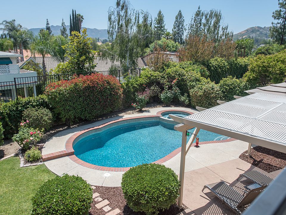 Beautiful, updated 5 bedroom 3 bath Agoura Hills home in a wonderful cul-de-sac location. Dramatic double door entry. Updated kitchen with granite tile counters, tile floors, breakfast bar and walk-in pantry. Newer double pane windows and sliders. Newer stainless steel appliances. Family room with picture windows and stone fireplace. Spacious master suite with walk-in closet. Distressed engineered wood floors. Decorator touches throughout. Backyard features saltwater pool and spa with removable fence, grass play yard, covered patio and barbecue area. 3 car attached garage. Las Virgenes School District. Rent includes weekly gardening and pool cleaning services. Plus much more. Owner responsible for gardening and weekly pool cleaning. Cats and small dogs OK. Additional pet deposit may be applicable. Security deposit and first month's rent due at signing.