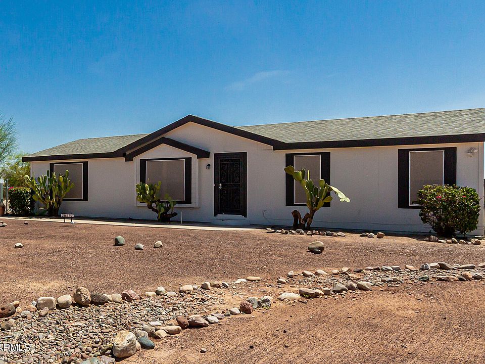 Discover this charming home located on a 1.5 acres! Note - the lot is much larger than the just the fenced in area. This home features 3 bedrooms, 2 bathrooms, a detached 3 car garage, and plenty of space for your toys! Inside, you'll find wood-look flooring, vaulted ceilings, and stylish neutral tones in a comfortable and bright layout. The impeccable kitchen shows white cabinetry, quartz countertops, a pantry, stainless steel appliances, and a prep island. Enjoy casual dining and quiet evenings in the large screened patio. The vast backyard offers a low-care landscape for easy living and a storage shed for convenience, as well as abundant space for entertaining and relaxation. As an added bonus, the solar panels are owned FREE and CLEAR, hurry now!