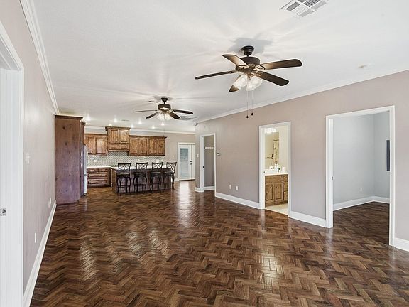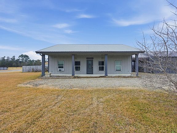 Beautiful custom home on a quiet dead-end street with room to live, work, and play. Inside features herringbone-pattern vinyl plank flooring throughout living areas and bedrooms, distressed alder wood cabinetry, and spray foam insulation. The kitchen offers Corian countertops, a seamless deep sink, large pull-out drawers, a spacious island seating four, and generous pantry storage. The primary suite includes a spa-like bath with double sinks, dressing area, oversized soaking tub, doorless walk-in tile shower, and custom lighting, plus a huge walk-in closet. Enjoy full-length covered front and back porches, a fenced backyard, stocked fishing pond with dock, and mature mayhaw, pecan, and pear trees. Property includes a 1,200 sq ft workshop with full bath, 14x40 RV shed, and is zoned for farm animals. Ring security features and propane gas stove complete the package.