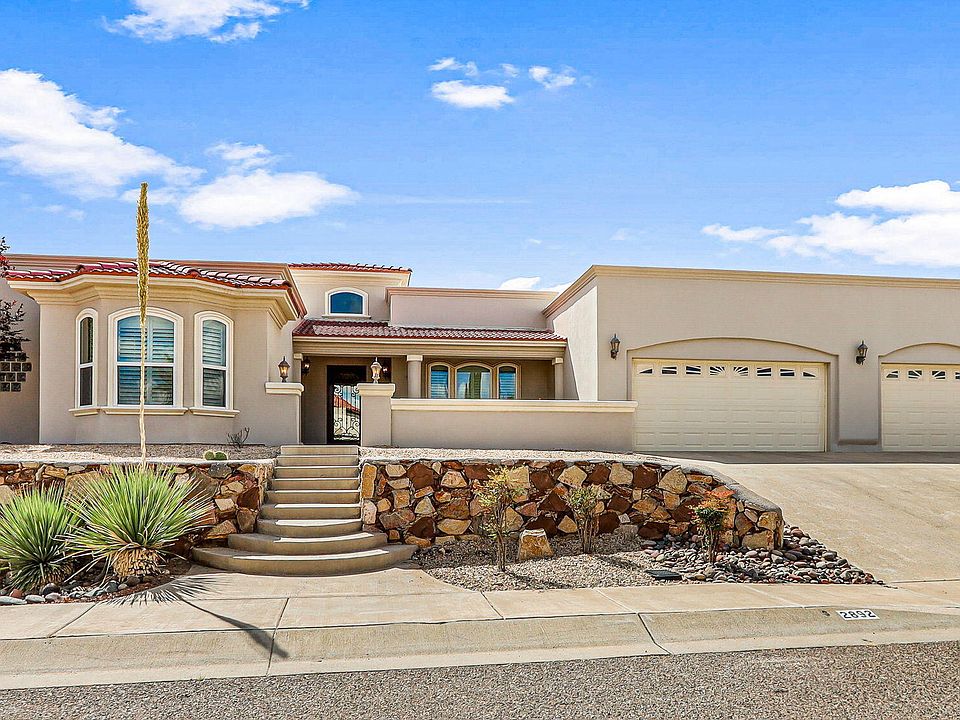 This property offers sweeping Organ Mountain and city views in a spacious 4-bedroom, 2.5-bath home with over 3,000 sq. ft. in a desirable neighborhood. The open floor plan features a beautiful kitchen with granite countertops, island, breakfast bar, built-in hutch, and all-new appliances. Flooring throughout is tile and newly installed hardwood--no carpet. The primary suite includes walk-in closets, dual vanities, and a jetted tub. A complete Jack-and-Jill bath connects two bedrooms, while the 4th bedroom makes an ideal office. Additional features include a formal dining room, 3-car garage with workspace, central vacuum system, refrigerated air, and plumbing for a water softener. Recent updates include elastomeric roofing with warranty, a 5-year warranty on exterior stucco coating, and new backyard landscaping. This home is move-in ready and built for both comfort and convenience. Virtual staging has been added to the photos for visual enhancement and spatial perspective.
