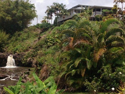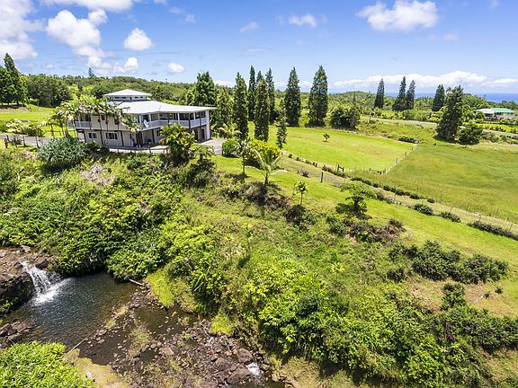 Magical waterfalls and easily accessible stream, gorgeous ocean and Hilo Bay views, pasture for your animals, room for your vegetable and fruit gardens, plus a lovely well maintained home. Pride of ownership abounds from the moment you enter through the custom aluminum security gate and drive down the wide concrete driveway onto the property. The home is 2 story with a large area downstairs that would be perfect for your guests and/or extended family. It includes a spacious family room, large den, bedroom, bath and the laundry room. Each of the bedrooms in this wonderful home has its own private lanai. Upstairs - the great room - with exposed beam vaulted ceilings- includes the recently remodeled kitchen with Quartz counters, living/dining area and access to three bedrooms and 2 baths. There is a wonderful room sized lanai off the dining area that has expansive views of the ocean, Hilo and rolling pastures. This is a perfect space for entertaining - even on a rainy day. There is also a large utility building for animals and/or storage. After a hard days work you can look forward to relaxing in the gazebo and listening to the sounds of cascading water and enjoying the views of the stream and waterfalls. Truly a one-of-a kind property.