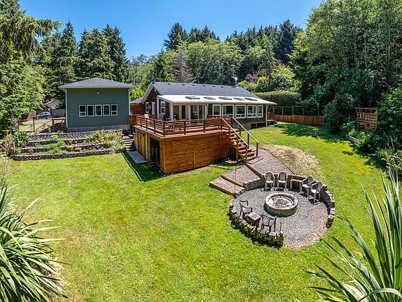 This quintessential Pacific Northwest home, nestled in the Starr Creek area of Yachats, is walkable to the picturesque 804 beach trail, 7 miles of sandy beaches and the Siuslaw National Forest trails. The charming 2-bedroom bungalow has been lovingly updated & meticulously maintained, ensuring there are no deferred maintenance issues. Two primary bedrooms come with en suite bathrooms, and private deck access offering peacefulness and convenience. Inside, you'll find a large sunroom with beautiful nature views leading to covered decks, a patio, large sun decks and landscaped fire pit area great for entertaining and relaxing. The natural light in the sunroom complements the living room where a woodstove adds to the inviting atmosphere. The kitchen features elegance and practicality with granite countertops, newer cabinets, & stainless steel appliances that combine both style and functionality. Do you need Flex Space for an office, studio, etc? The shop has it and a plumbed bath. This home lives large with all of the decking and workshop areas. You'll find so many outdoor seating options. There's a large deck that is partially covered for entertaining. It wraps around the house from the front access gate to the primary and guest bedrooms with access gates to the backyard, garden, firepit and walkout basement. The generously sized firepit has brick in the bottom to help retain the heat and comfortably seats a dozen friends and family members.