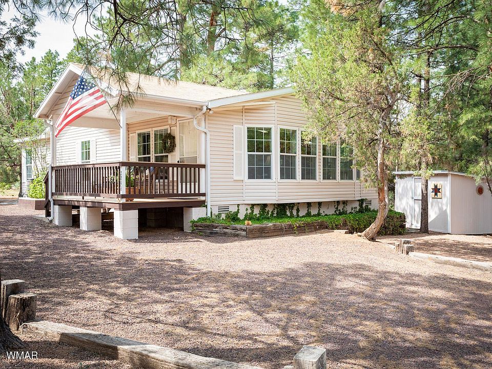 Well cared for Cavco on a large corner lot that is perfect for full time living or a weekend retreat. Drywall throughout, open floor plan with fireplace, spacious kitchen and lots of windows to enjoy the forest views. Home is on a solid cement slab and stem wall, front and rear no maintenance Trex decking, low maintenance landscaping, raised bed garden area and a storage shed. Located on a paved road for easy year round access.