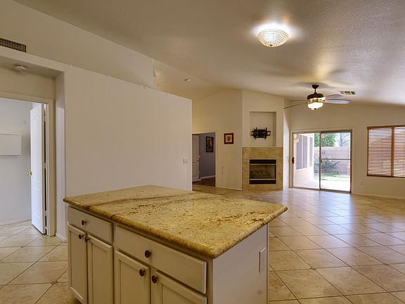 Beautiful fireplaceBuilt-in microwaveStunning quartz countersKitchen islandTile flooringVaulted ceilingsGrassy and private backyard