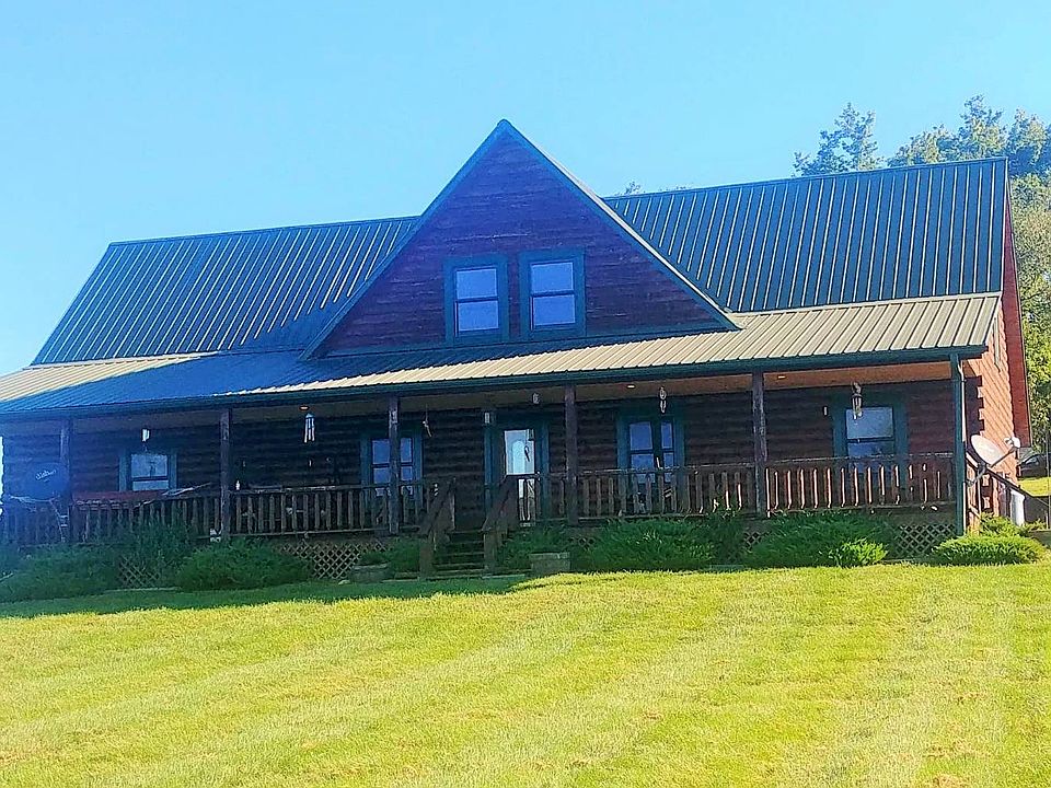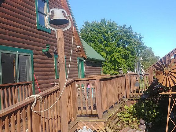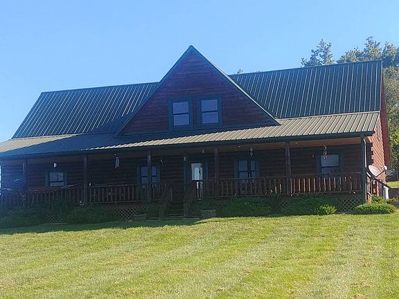 Beautiful log cabin has newer metal roof, many electrical updates,lighting, and bathroom updates. Large front porch perfect for viewing the pond. Back deck perfect for entertaining with the large above ground pool with deck built all around.