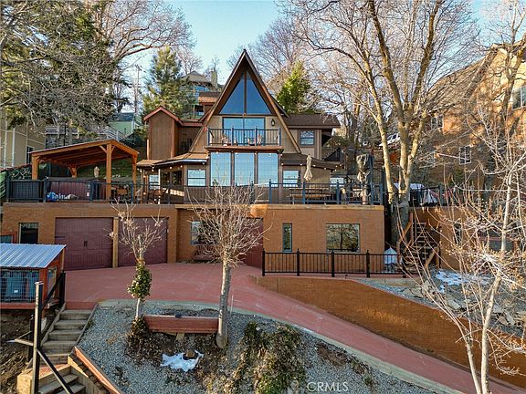 WOW!! What an amazing opportunity! This amazing tri-level mountain chalet is calling your name to the beautiful San Bernardino Mountains in Magical Lake Arrowhead. This stunning property is perfect for entertaining your family and friends, complete with a giant spa, sauna, gym, with open concept living room and kitchen area complete with a fantastic wet bar and more. The details in this stunning home need to be seen to be appreciated. The living area is full of light and warmth with beautiful windows boasting the incredible panoramic views, open to the kitchen with a large kitchen island to gather around. The beautiful primary suite bedroom with wall fireplace is on the main level, attached to a dream primary bath complete with large walk in shower, and in ground jet tub for long relaxing baths. The home also has three other spacious bedrooms are on the second level with another bathroom, and then a spacious loft on the third level with more amazing views, topped off with the sauna and plenty of room for endless activities! The home comes complete with a whole house in-line generator to keep the lights on if the power goes out, and a newly installed stage 4 water filtration system for the entire home. There is plentiful parking, as a nice long driveway takes you up to a 3 car garage with plenty of room for storage, cars, off road toys, and even areas for a workshop. In addition, you also have dual access in the back of the home on an access road with direct entry to the loft in back. The gym is behind the garage, which can also be used as a wine cellar if you prefer. The beautiful fenced and landscaped, terraced yard has it's own irrigation system, complete with kids playing area jungle gym and an absolute dollhouse of a playhouse for the kiddos to get lost in their imagination for hours. Lounge in the giant covered spa, big enough for a party in itself, watching the sunset or enjoy as the snow falls around you soaking in the breathtaking views as you lounge on the decks or patio areas. The unbelievable views of the desert mountain landscapes can be seen all throughout the home from the inside with the most amazing wall of beautiful windows, or from all areas of the wonderful wrap around decks. Not only does this home come with lake rights, but access all of the offroad trails you can dream of at the end of the block. This incredible deal of a home is priced to sell, so don't wait another minute, or you will miss your chance!