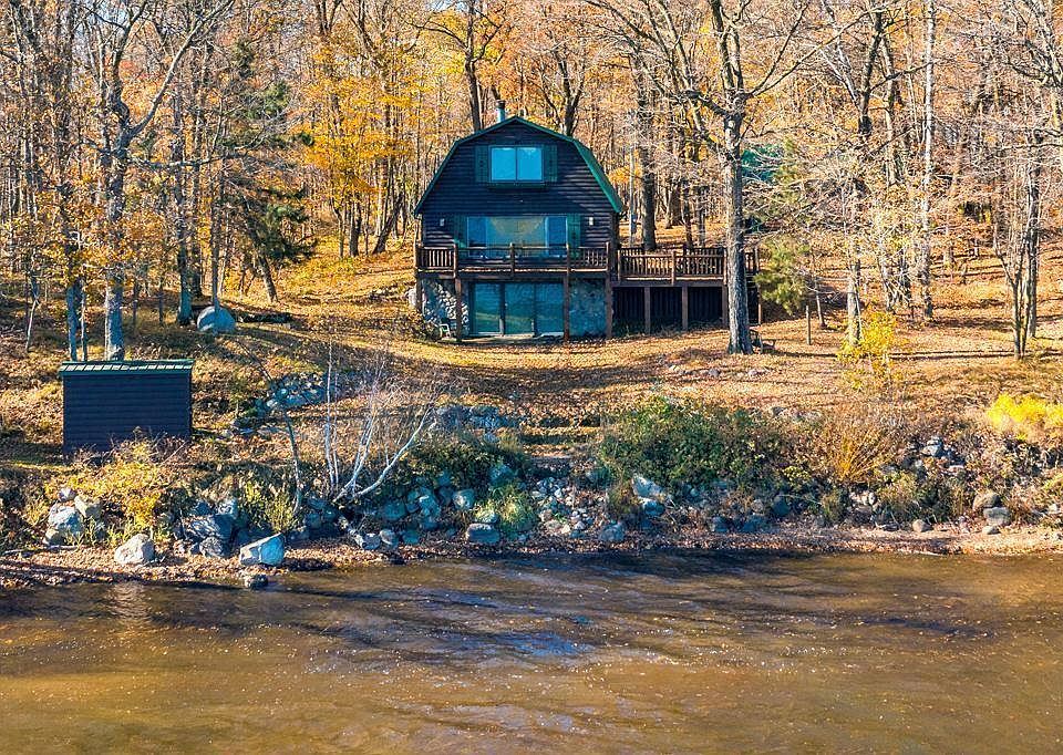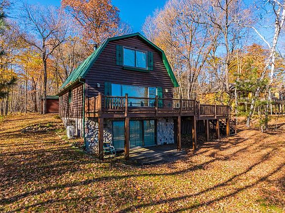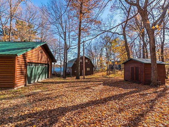 Embrace the Up-North Experience on one of the area’s most highly sought-after lakes…great boating, fishing, swimming, skiing and just relaxing…welcome to Farm Island Lake. This charming 3+ bedroom, 3 bath ¼ log sided home features 107’ of lakeshore, easy elevation to a great hard lake bottom, 1.3 acres of serene privacy nestled beneath a canopy of beautiful mature hardwoods, breathtaking sunrises, large open floor plan, a main floor bedroom, knotty pine tongue & groove throughout, soaring cathedral ceilings, huge lake-side windows, a quaint kitchen and dining area and an impressive great room with a wood-burning fireplace and walks out to a huge wrap-around deck. The spacious upper level is well planned and can sleep large groups of family and friends…there are 2 private areas, an open loft and its own bath. The lower level is host to a large walk-out family room with another wall of windows that leads to a lakeside patio, an additional bedroom and bath. This property also includes a 24x30 2-stall garage, a storage shed, an aluminum roll-in dock and an additional lakeside shed for all your toys. This private getaway is exactly what you dream about when coming to the lake…wind your way through the woods to this private retreat…once here, you will never want to leave. BONUS…this property comes FULLY FURNISHED AND EQUIPPED!