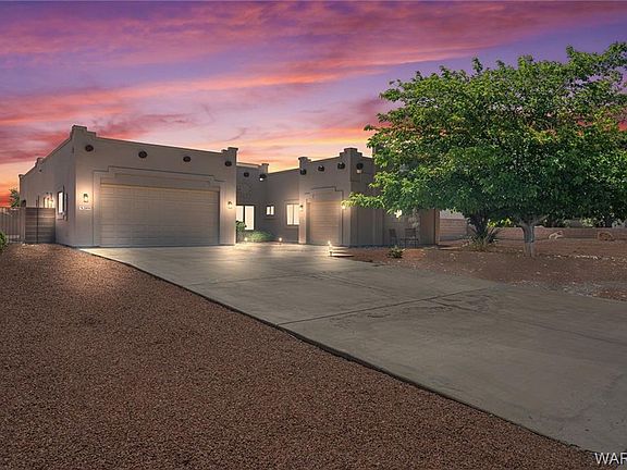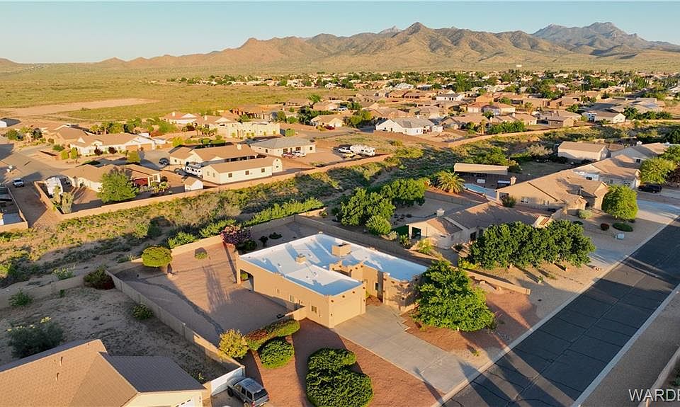 This stunning Santa Fe-style custom home in Rancho Santa Fe was designed to showcase its surroundings. From the living room, dining area, and primary suite, you'll enjoy uninterrupted views of the Hualapai Mountains, filling each space with natural beauty and light. Offering 3 bedrooms, 2 bathrooms, plus a versatile bonus room with a walk-in closet (ideal as an office, den, or 4th bedroom), this 1,943 sq ft residence blends thoughtful design with everyday comfort. The primary suite is a retreat of its own, featuring patio access, a jetted tub, a separate shower, and spacious walk-in closet, all with those same serene mountain views as your backdrop. The inviting living and dining spaces center around a Kiva-inspired fireplace and custom southwest cabinetry with intricate inlay details. Large sliding doors, complete with motorized shades, connect seamlessly to the expansive rear patio, perfect for entertaining or quiet evenings. With two garages (a 2-car and a 1-car, both finished with epoxy floors), custom shutters throughout, and a .46-acre lot with desert landscaping, RV parking, and room for a pool, this home is a true desert oasis designed for the Arizona lifestyle.