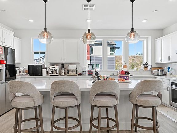 Upstairs, the primary suite feels like a private retreat with a walk-in closet and a spa-inspired bathroom. Two additional bedrooms share the upper level, while the ground-floor suite with its own full bath is ideal for guests, roommates, or a home office. Every detail from the EV-ready two-car garage to the energy-efficient systems was designed for a modern lifestyle. Outside, enjoy your own private, low-maintenance yard and covered patio the perfect backdrop for weekend brunches or summer nights with friends.