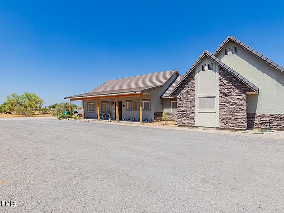 Rare 5-acre horse property with unbelievable San Tan Mountain views! No HOA! Beautiful Ranch home with stone exterior and circular drive. Large arena, tack room and corrals! New kitchen cabinets and quartz counter tops being installed. New matching kitchen appliances. Master bedroom with double sinks, separate bathtub and walk in shower and walk in closet. Gated pool with new water pump and sweeper. Front and back covered patio to watch those AZ sunrises and sunsets! Come check out this one-of-a-kind property!