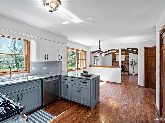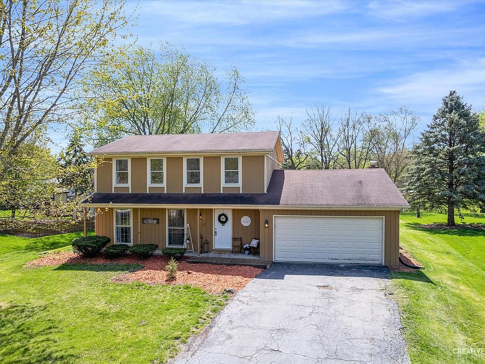 So much to love, beginning with a FANTASTIC & RARE 0.44 ACRE LOT! 4+1 Bedrooms, 3+1 baths and partially finished basement. Welcoming 30' long front porch. Abundant natural sunlight throughout, large welcoming foyer and spacious floorplan. Living room with vaulted ceiling, fireplace and French doors leading to the massive backyard. Loads of recent updates! 2023/2024: Hardwood floors, carpeting, kitchen door & drawer fronts professionally refaced, granite counters, tile backsplash, new stainless appliances, new front door, all new lighting fixtures, door hinges & knobs, whole house paint, bathrooms remodeled, driveway sealcoating, recessed lighting, septic pumped. 2022: Washer/dryer, backyard French doors. 2019: Furnace & A/C. Excellent opportunity for an amazing backyard and creating Pinterest worthy curb appeal. Basement includes large recreational area, 5th bedroom, bathroom, spacious laundry room and concrete crawl for additional storage underneath family room. No HOA! Unincorporated! Dist 204 Schools: Clow/Gregory/NVHS