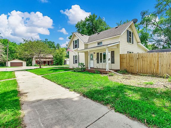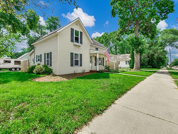 Main level bedroom, bathroom, and laundry as well. Open stairway to upper-level master suite with large bedroom and immense master bath + ABUNDANT closet space. Basement holds a rec room (man cave) zone. Impressive vibe, style, AND well-maintained, boasting a fresh furnace. Ready to turn the key and move in, all at an affordable price Situated on a calm corner lot near town's edge and a block from the river rests this quaint 1.5-story classic! Thoughtfully updated with a farmhouse ambiance while retaining its 135-year-old allure! Roomy concrete driveway with stamped & colored border leads to massive 24'x24' garage (includes shed). Expansive, serene deck & porch. Inviting gas fireplace with shiplap details. Vaulted ceilings & pergo floors. Butcher block counters and coin tile backsplash with farmhouse apron sink.