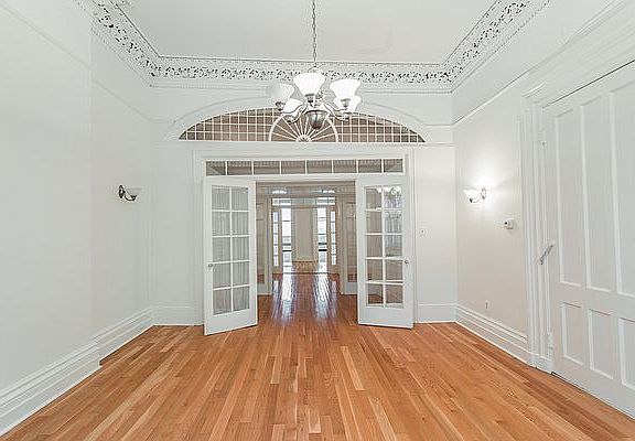 This lovely apartment has 12' ceilings, ornate plaster moldings, lattice, French doors that separate the two bedrooms, tin ceilings & hardwood floors through out