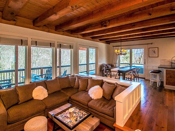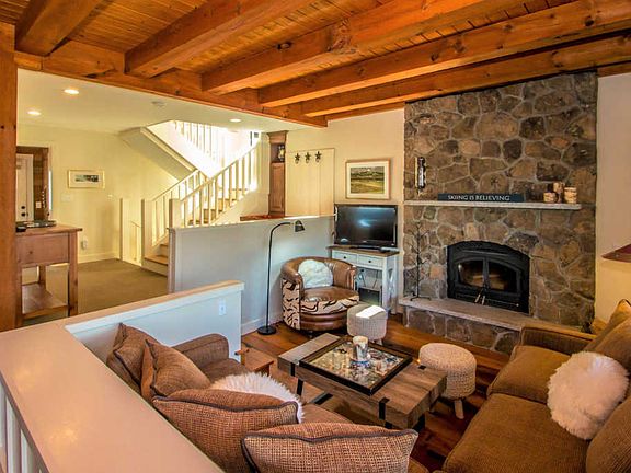 Relax after a long day on the mountain in this luxury townhouse just steps from the trail! Completely remodeled in 2008, this home was taken down to the outside walls and redesigned with skiers in mind, including a heated ski tuning/mudroom with space for all of your gear. The first floor is open plan with a built-in seating area facing the cozy wood-burning stone fireplace, and a tastefully updated kitchen with granite counters and copper accents. Two sets of sliders lead you out to a covered porch and wrap around deck, complete with a hot tub and propane fire table. The upper level is easily accessible with a widened staircase, spacious bedrooms featuring stunning mountain views, and a 3/4 bath. On the lower level is a family room with a gas fireplace, a bedroom with built-in bunkbeds & storage cubbies, laundry area, and another 3/4 bath. This turn-key property is being sold beautifully furnished, less a few exclusions. You will love the mountain views, easy ski trail access and great location. In the summer months there is a pool and tennis court just down the road. For a change of pace, hop in the car for a short trip to the over 150 tax free shops in North Conway Village or enjoy one of the many local area restaurants and pubs. Fantastic vacation home, primary residence or investment property with rental potential.