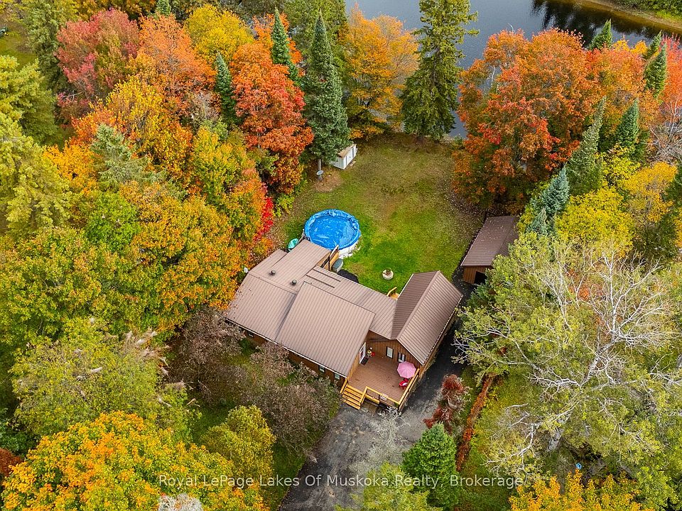 Set on a peaceful bend of the Muskoka River with 100 feet of water frontage, 29 Ascott Lane delivers easy, level riverfront living on almost 1/2 acre. The setting is ideal, minutes to charming Port Sydney, with a short drive to both Bracebridge and Huntsville. Built in 1994, the home flows naturally from one space to the next. A welcoming front deck opens to the vaulted eat-in kitchen where warm cabinetry and a propane fireplace add comfort, and electric baseboard heat serves the balance of the home. From the kitchen, the plan opens to a bright dining area and a window-wrapped living room that frames calming views across the large, level yard to the river. The home offers 3 generous sized bedrooms and a four-piece bath. The spacious primary bedroom sits on the opposite side of the home and opens to a private riverside deck. Two additional bedrooms complete the sleeping wing. One connects through double French doors to a charming Muskoka room, your favourite three season lounge with a walkout to the deck and the propane heated, professionally maintained, above ground pool (installed 2018). The third bedroom offers flexible space for guests or a home office. A practical utility/laundry room keeps chores out of sight. Outside, the lawn is made for gatherings, gardens and easy water access. A single-car detached garage with a concrete floor handles storage and hobby space. Whether you're seeking a relaxed year-round residence or a low-maintenance riverfront getaway, this well-kept property offers the Muskoka lifestyle with straightforward comfort and authentic charm.