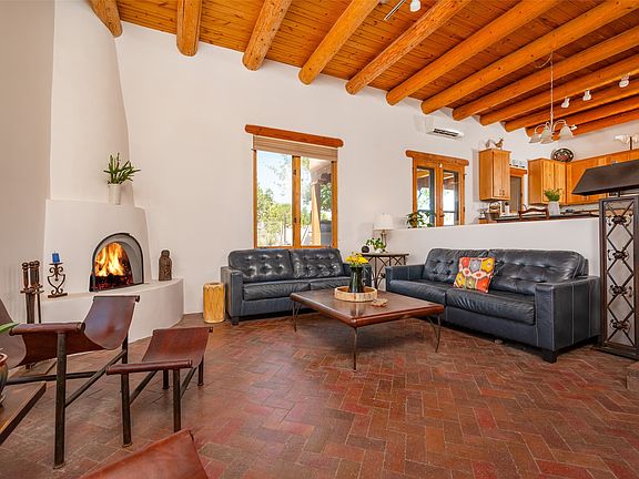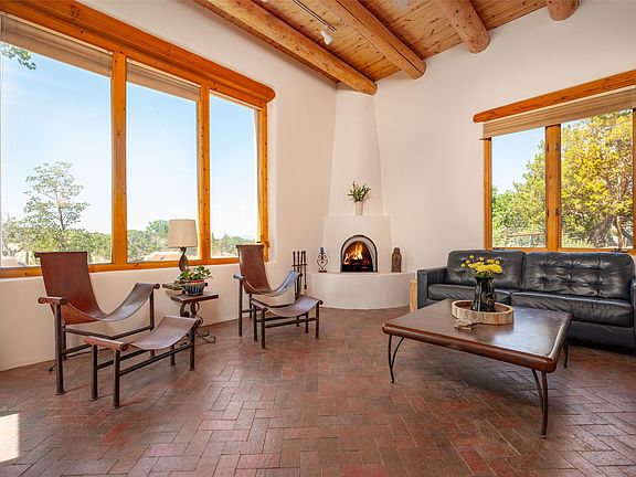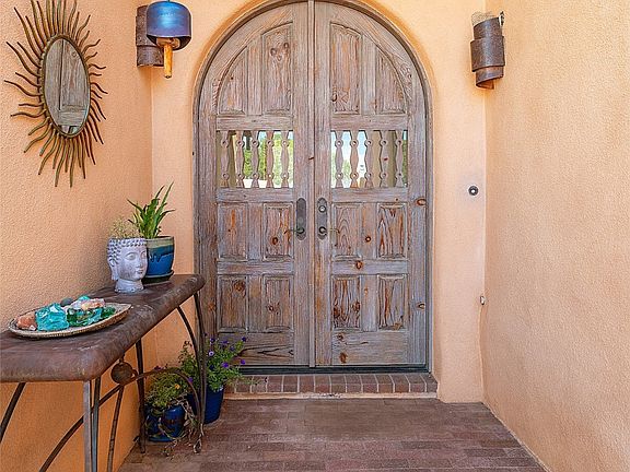 Enter the peaceful front courtyard, continue through the vintage Mexican carved doors into the dramatic entry with soaring ceilings This beautiful Eldorado home was built around 1991 . The previous owners added an addition to create a master bedroom with kiva fireplace. The home has brick floors throughout, large windows to take in the views and 2 additional courtyard spaces for outside enjoyment. The kitchen has been remodeled. There is great separation between the 4 bedrooms and 3 baths, with a choice of which bedroom you want to be the master, both lead to a courtyard. Don't miss this beautiful home.