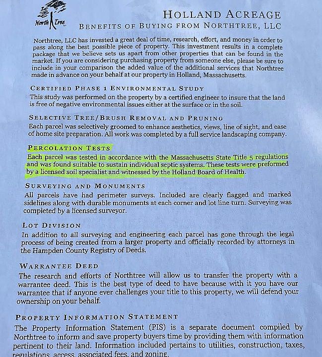 $109,900 18.496 acres, Lot 2, zoned Agricultural Residential, septic and well. Perc test done when purchased in 2008. Two miles from RT 84 on Holland/Sturbridge, MA line. Go to https://town.holland.ma.us to view bylaws.
