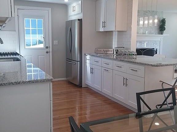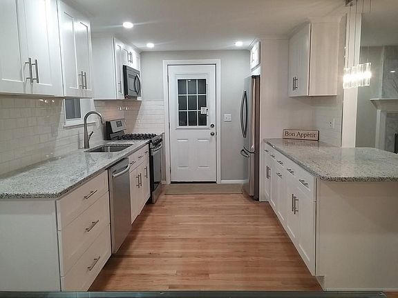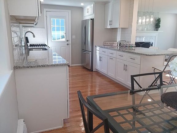 Newly renovated ranch in a lovely neighborhood setting. Open concept living space perfect for entertaining. Gorgeous new kitchen with white maple shaker cabinets, granite countertops, stainless steel appliances including french door fridge and 5 burner gas range. Peninsula with bar seating open to living room. Bright sunny living room features gleaming hardwood floors, oversized picture window and floor to ceiling marble fireplace with custom built mantel. Newly expanded bathroom with custom tiled floor and tub surround, granite topped vanity with double sinks and custom built linen storage. 3 bedrooms all with hardwood floors and double closets. Huge finished bonus room in basement. New vinyl siding, all new Harvey energy efficient tilt in windows, new interior and exterior doors. All new electrical, updated plumbing and FHW/gas heat. LED lighting throughout. Large yard with all new professional landscaping and a newly paved driveway. Great commuter location close to Rt 3 and 495