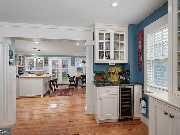 Sun-drenched kitchenBosch dishwasherRecessed lightingDouble vanityVintage turned stairsHardwood floorsStone walkway