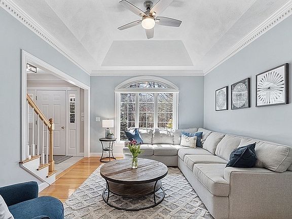 Bright and beautifully maintained 4BR, 2.5BA Colonial in the Franklin School district w/ stunning architectural details throughout. Entry foyer draws guests into the elegant living room with arched window and tray ceiling. The formal dining room with decorative moldings and is located near the large eat-in kitchen with SS appliances, Corian counter tops, pantry, desk and room for a dining table. The kitchen flows nicely into the the fireplaced family room, with large picture window and slider to the deck and rear yard. The 2nd floor has a large Main Bedroom Suite with a private bath with Jacuzzi tub, double vanity and a thoughtfully designed custom closet. There are 3 additional bedrooms each with great closet space, full hall bath, as well as laundry w/folding area and large linen closet. Finished lower level, attached 2 car garage and beautifully landscaped yard. Great neighborhood with sidewalks, easy highway access and walking trails to Harold Parker State Forest. Move-in ready!
