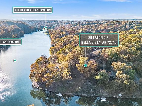 Properties like this don't come along often! A large gently sloping "walkable" 0.73-acre lot with 166ft of lake front, centrally located on beautiful Lake Avalon! Plus, a NEW ROOF, gutters & skylight installed Oct 2025! Natural light & wood floors flow throughout the house. Large deck (half screened in) is accessible from dining room & primary bedroom. Kitchen has granite counters, stainless appliances, pantry & tons of cabinet & counter space. Living room has large windows with views of the front yard & stone gas fireplace. All 3 bedrooms & laundry room are upstairs. Downstairs is a bonus room with walk-out access to a covered deck & the backyard. Exterior stairs connect the upper & lower decks. Enjoy everything that Bella Vista has to offer - located close to the Bella Vista Country Club Golf Course, Tanyard Creek, Bella Vista Waterfall & the Little Sugar trail system. Easy access to the water, fire pit & swim deck that conveys. New stone sea wall recently installed. New furnace 2023. Shed & propane tank convey.