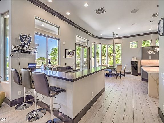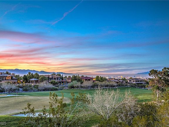 Fabulous golf & Las Vegas Strip views are the focal point of this premium oversized 1/3-acre golf front lot on the 1st green in guard gated Anthem Country Club golf & tennis community! Remodeled, 1-story Pembroke model has an open concept great room with custom entertainment wall and wet bar. Dream kitchen features modern quartz counters with waterfall, new GE Cafe ovens, and walk-in pantry! Primary bedroom has sitting area with strip view, remodeled spa bathroom, and custom walk-in closet. All en-suite bedrooms and den/office with built-ins. You will fall in love with the backyard highlighted by pool & spa, relaxing waterfalls, firepit, BBQ island, Strip views, all overlooking the golf course. 80-foot driveway leads to the 3 1/2 car garage with storage. Extras include wood plank tile, shutters, shades, power solar screens, crown molding, Lutron switches, ceiling speakers, tankless water heater, water treatment, remodeled bathrooms, cameras, and new AC units with smart thermostats.