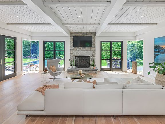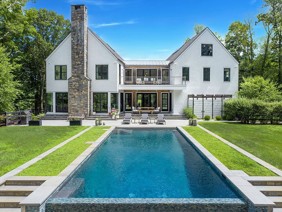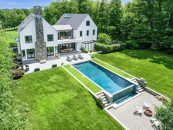 Exceptional custom-built home by top tier builder - Fletcher Custom Homes and designed by acclaimed architect Chris Pagliaro with interiors by Mark Finley. Sophistication and architectural details at every turn. The Main Level impresses with soaring ceilings, radiant heated floors, and walls of glass. An impressive Chef's Kitchen features 2" waterfall island tops and a stunning glass wine wall with cable racks for 500 bottles. Open-concept floor plan invite both entertaining and relaxation and is bathed in natural light. 2nd Level features 4/5 Ensuite BR's include a tranquil Primary Suite w/spa-like bath, spacious walk-in dressing room & balcony overlooking the breathtaking rear yard. A Family Rm, Gaming/Media Rm & Laundry complete this level. Third floor offers a Media/Flex Space + Office with oversized ridge skylights. A walk-out lower level with polished concrete floors includes a full gym area, storage, and potential for Au Pair Suite, indoor Pickle Court, or Bonus Room. Resort-style outdoor living is unmatched with a saltwater infinity-edge pool, auto cover, waterfall, outdoor shower, fire pit & bocce court. Expansive lawns, curated landscape + hardscape unfold across 2+ private acres. Heated 4-car garage for the auto enthusiast. Being sold fully furnished. Coveted SW Redding location with direct access to Devil's Den Preserve and minutes to both Ridgefield and Wilton. Approx. 1 hour to NYC. A true one-of-a-kind lifestyle or weekend retreat. Impossible to Re-Produce!