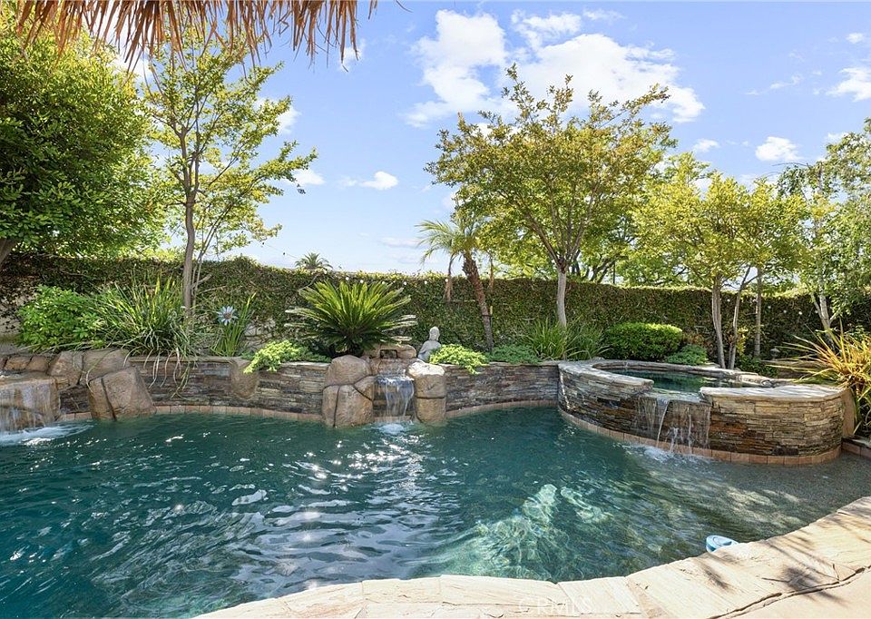 A new XL picture window and matching sliding glass doors in the second living room enhance the indoor/outdoor living, complete with custom electronic blinds. In the backyard to enjoy a custom pergola with fan and lighting, Pebble Tec pool and spa with Wi-Fi controls, a built-in BBQ, and a gas firepit—all surrounded by lush landscaping.