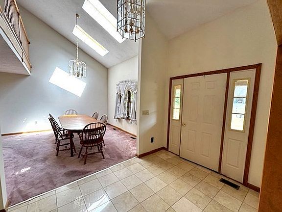 Well loved one-owner home in a very desirable neighborhood. You'll enjoy this contemporary floorplan with first floor Primary Bedroom and two car attached garage. Vaulted ceiling with skylights in the Family Room and Dining Room give the spaces a bright and airy feel. Living Room also has vaulted ceiling and a wood burning fireplace. Tiled Kitchen with large pantry closet has granite countertop with undermount sink. Primary Bedroom has its own bath and walk-in closet. Two other generously sized bedrooms and second full bath on the 2nd level. Carpets are original, but there were never pets living in the house. Wood trim and 6 panel pine doors are in excellent shape. Plenty of storage closets in this home. Laundry area is located in the half bath off the family room. Slider leads to a large deck facing a great view to the north. The walkout basement is unfinished and HUGE. Central AC was just added last year. Central Vac is installed. Roof was replaced in 2006-07 with 30 yr shingles.