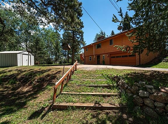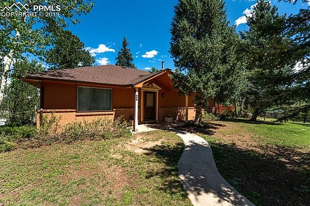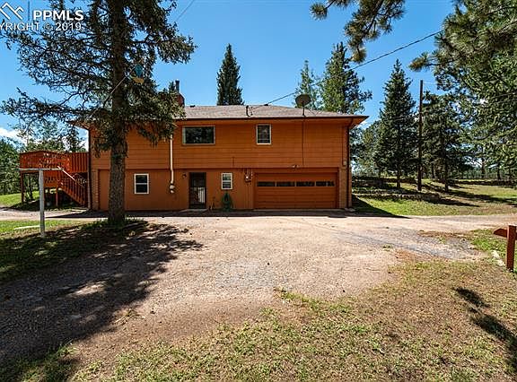 Solid home on 1/2 acre corner lot with mature trees and views of Pikes Peak. Spacious and bright living area has huge windows to enjoy the beautiful views. Wood burning fireplace AND wood stove on main level. Kitchen walks out to large deck. Main level master w/ attached bath, second bedroom also has attached bath. Walk out basement has Large family, another large bedroom, 3/4 bath and laundry. Over sized 2 car garage; storage sheds; nice neighborhood, close to town.