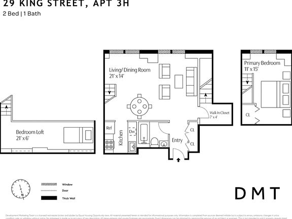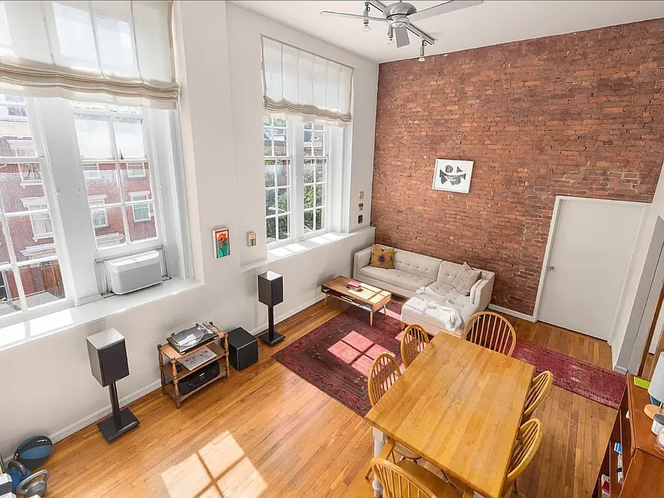 Spanning nearly 1,000 square feet, the unit features an expansive living/dining room, kitchen with stainless steel appliances, hardwood oak floors, exposed brick, and a dishwasher.