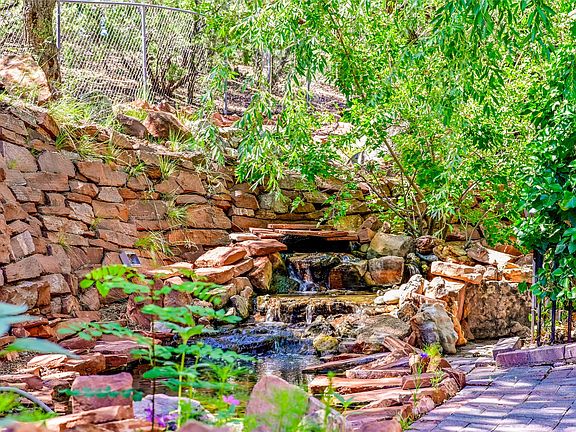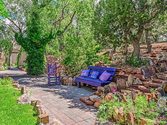 The main residence features a grand living and entertaining space adorned with multiple cozy kiva fireplaces, high viga accented ceilings, brick floors, iron work, colorful floral wall motifs, and traditional craftsmanship. Many recent practical improvements to the roof, exterior, and systems have also been made.Four spacious bedrooms make this a comfortable retreat for full-time living or hosting of guests. Not to be missed is the spacious, upstairs artist’s retreat with panoramic views - the perfect place to paint, work, write, and create! The primary suite is private and appointed with a large ensuite bathroom, access to the enclosed in-ground spa, patio access, and sweeping sightlines across the high desert landscape. The grounds are equally serene with water features and fountains, multiple garden beds, and private patio enclaves. A long western-facing, covered portal, spanning the length of the main living room is the perfect outdoor extension to the main home’s grand indoor living. A detached 1BD-1BA guest house, with its own garage, offers privacy and comfort for visitors, family or invites the potential for rental generating income. Whether you’re soaking in the golden hour light from one of the many outdoor living spaces or relaxing by one of the property’s four fireplaces, this one-of-a-kind property offers an unparalleled canvas equipped with undeniable tranquility, vistas and convenience to Santa Fe’s exquisite destinations.
