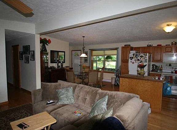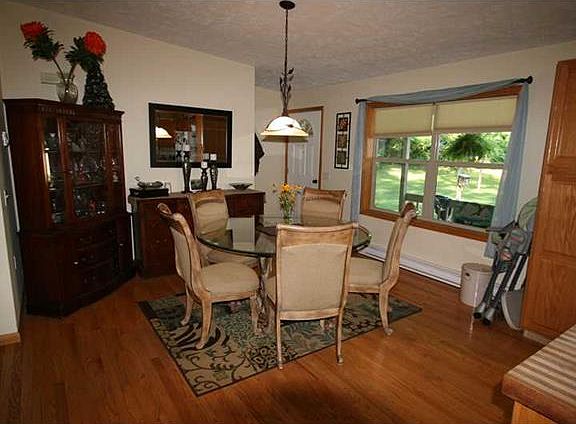 This home is situated at the end of a lane on top a hill very secluded surrounded by trees. The porch wraps around the house so you can enjoy sun and shade all day. This home features beautiful hardwood floors throughout. The family room features a log burning fireplace. Open floor plan.