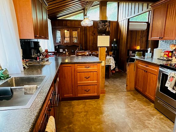 This chalet style bungalow with beautiful vaulted ceilings is tucked away on a nice quiet street in town. The main level offers a large kitchen with dining area that opens up to a living room with vaulted ceilings. Down the hall you have 3 bedrooms, the main bathroom and an ensuite off of the main bedroom. Downstairs there is a family room, laundry area and plenty of storage space. Improvements to the home over the past 5 years are; brand new kitchen installed, carpeting removed and laminate flooring installed throughout the main level, electrical panel upgraded to 200 amp, water heater replaced, oil furnace removed and baseboard heaters installed, ductless heat pump installed, wood stove installed & metal roofing put on.