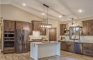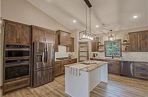 Stone-surrounded gas fireplaceCozy gas fireplaceVaulted ceilingsOpen-concept layoutStunning granite countertopsThree spacious bedroomsWalk-in closets