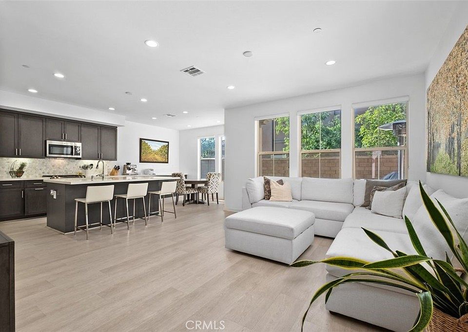 This home is set apart from all the others in the area, It has it's own private backyard and sunset views! Sophisticated, modern townhome with its own private entrance. This one-of-a-kind contemporary residence boasts modern amenities with a very unique style. On the main level, with its elegant light filled great room, dining and kitchen adjoining has light contrast flooring, with ebony cabinetry, including upgraded extended cabinetry into the dining area, white quartz counters with custom quartz backsplash, including oversize island. Stainless GE appliances, Kitchen Aid dishwasher complete the chef’s kitchen. Leading to the upstairs bedroom is open stairway, ebony handrail continues the contemporary feel. Oversized master bedroom and master bath including double sinks, upgraded tile flooring and gigantic walk-in closet. Upstairs laundry with sink and upper cabinetry, two adjacent bedrooms share a bath. Tesla car charger and epoxy garage flooring with extra storage. This home is better than new. Amenities in Baker Ranch, swimming pools, basketball courts, picnic areas, tennis, dog parks within walking distance. No Mello Roos.