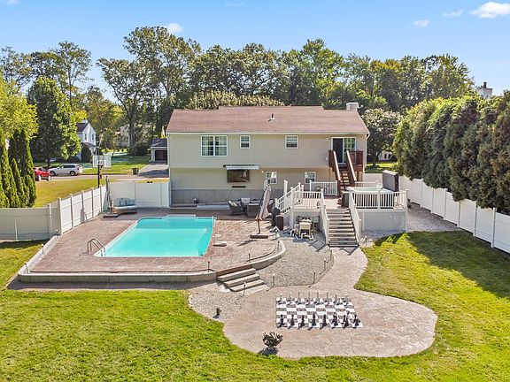 Welcome home! This beautifully maintained Raised Ranch offers the perfect blend of comfort, style, and outdoor luxury. When you step outside, prepare to be wowed! A two-tiered deck overlooks a fully fenced-in, expansive backyard designed for pure enjoyment. Take a dip in the heated in-ground saltwater pool, unwind in the hot tub, or host unforgettable gatherings on the stamped concrete pool deck with granite curb detailing. Granite steps lead down to a serene lower patio area, offering even more space to relax or entertain. The home features an eat-in kitchen with granite counters and high end stainless steel appliances. The kitchen is ideal for entertaining, with plenty of space for family and friends to gather. The spacious living room is a true showstopper with recessed lighting and a cozy wood-burning fireplace w/ an elegant marble surround-perfect for relaxing nights in. The primary bedroom suite is your private retreat, complete with a generous walk-in closet and plenty of natural light. A second bedroom and an updated full bathroom round out the main living area. Downstairs, the large lower level has been freshly updated with brand-new wall-to-wall carpeting-perfect for a family room or play space. The 2-car garage provides ample storage space and functionality. Don't miss your chance to own this move-in ready gem that checks all the boxes for indoor comfort and exceptional outdoor living. Schedule your private showing today!