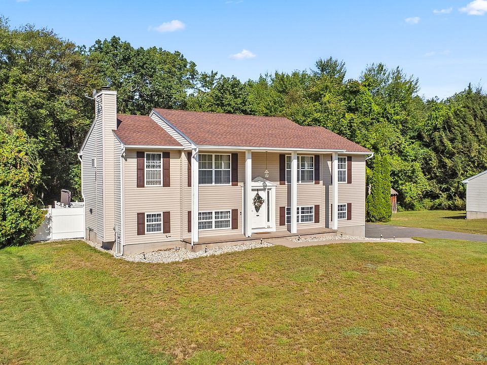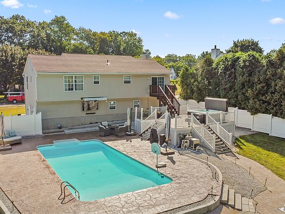 Welcome home! This beautifully maintained Raised Ranch offers the perfect blend of comfort, style, and outdoor luxury. When you step outside, prepare to be wowed! A two-tiered deck overlooks a fully fenced-in, expansive backyard designed for pure enjoyment. Take a dip in the heated in-ground saltwater pool, unwind in the hot tub, or host unforgettable gatherings on the stamped concrete pool deck with granite curb detailing. Granite steps lead down to a serene lower patio area, offering even more space to relax or entertain. The home features an eat-in kitchen with granite counters and high end stainless steel appliances. The kitchen is ideal for entertaining, with plenty of space for family and friends to gather. The spacious living room is a true showstopper with recessed lighting and a cozy wood-burning fireplace w/ an elegant marble surround-perfect for relaxing nights in. The primary bedroom suite is your private retreat and gets plenty of natural light. An additional two bedrooms and an updated full bathroom round out the main living area. Downstairs, the large lower level has been freshly updated with brand-new wall-to-wall carpeting-perfect for a family room or play space. The 2-car garage provides ample storage space and functionality. Don't miss your chance to own this move-in ready gem that checks all the boxes for indoor comfort and exceptional outdoor living. Schedule your private showing today!