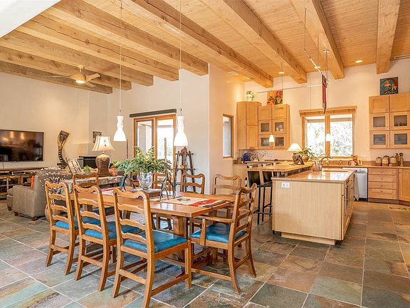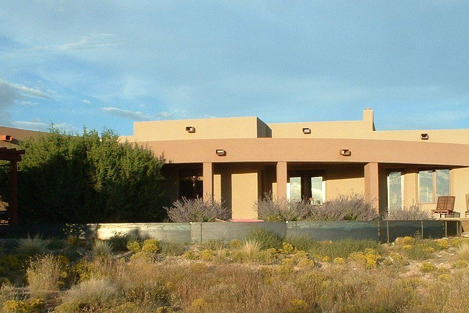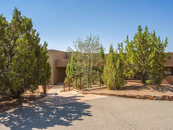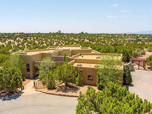 This impeccably maintained soft-contemporary residence sits on just over 2.5 acres and boasts views of the Sangre de Cristo as well as the Sandia and Ortiz mountain ranges. The open concept floor plan is perfect for entertaining and is complimented by a Chefs kitchen with immediate access to wonderful outdoor spaces on both sides of the home. The spacious owner's suite and two guest bedrooms are thoughtfully located providing privacy and attention to detail with custom closet cabinetry. The Studio is a bright and private space that could be used for almost any purpose. The heated three car garage is spacious with custom storage cabinetry. This home is just minutes from the plaza yet a world away.