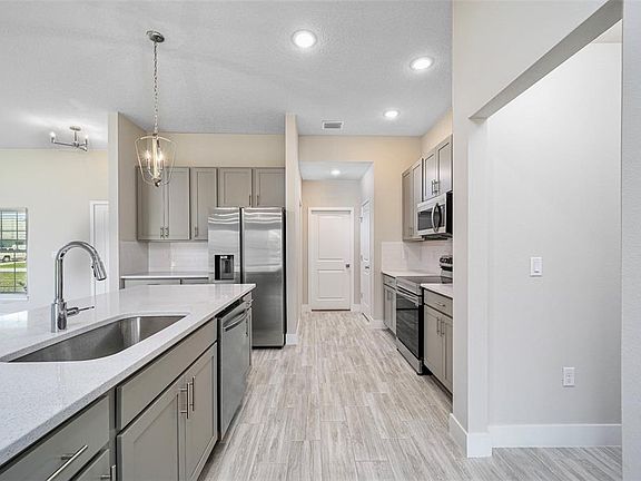 Built in 2023 and designed with today’s buyer in mind, this home truly feels better than new. Perfectly positioned on an oversized corner lot in the heart of town, it offers both space and convenience without the burden of HOA or CDD fees. Step through the front door and you’ll immediately be welcomed by a spacious open floor plan that feels larger than expected, enhanced by wood-look tile flooring that flows seamlessly through every room. The kitchen is the heart of the home, featuring gleaming quartz countertops, upgraded cabinets, and stainless steel appliances, all opening beautifully to the living and dining spaces. Larger bedrooms provide the comfort everyone craves, while upgraded lighting and tile-finished showers bring a touch of luxury throughout. An inside laundry room adds ease to everyday living, and the oversized rear patio invites you to relax or entertain outdoors year-round. Every detail has been thoughtfully upgraded, creating a home that blends style, function, and comfort. This is more than just a house—it’s a place you’ll be proud to call home.