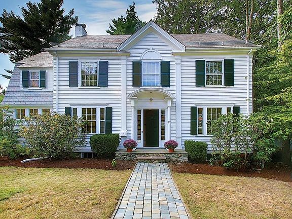 NEWTON, Chestnut Hill ... This beautiful center-entrance Colonial Revival-style residence, with a slate roof, is located in Historic Chestnut Hill on a nearly 16,000 square foot level lot. The first floor has a welcoming entrance and a lovely staircase. The living room, with a fireplace, bookcases, window seat, and recessed lighting, leads to a spacious sunroom with more built-in shelving and a pretty tiled floor. The kitchen has been updated with granite countertops and stainless steels appliances and opens to the dining room. This level also has a powder room and a screened-in porch. The second level features a bright master bedroom suite with a walk-in closet, an updated tiled bathroom, and a sitting room or office; two other bedrooms; and a bathroom. The third floor has a bedroom and a full bathroom as well as a storage room. Amenities include hardwood floors throughout the house, central air-conditioning, handsome moldings, and high-end finishes, materials, and fixtures.