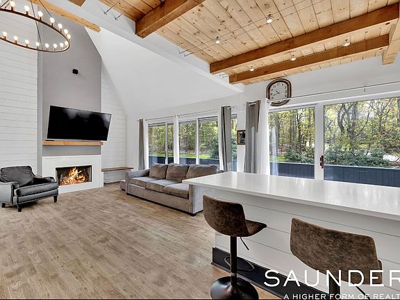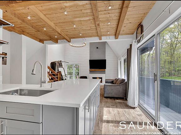 Perfect for a summer escape or year-round retreat in the Hamptons, this luxurious and chic contemporary home in a quiet neighborhood is just moments from the water and boasts stunning renovations and upgrades. Sited on .50 acre, the 2-level home has 4 bedrooms, 2 full and 1 half baths 1,800 +/- sq. ft. of living space, plus 600 +/- sq. ft. finished lower level, and an attached 2-car garage. The home's open-concept design is warm, inviting, and sleek, with easy indoor-outdoor living prioritized throughout the home. Interiors are highlighted by beautiful wooden accents and pearly white interiors with exposed beams across the tall ceilings. A fireplace and chimney bisect the elegant shiplap walls in the great room, reaching to the arched, double-height ceilings. Sharing a wall of glass sliding doors to the wraparound gallery porch, the chic chef's kitchen includes a unique L-shaped eat-in counter and stainless-steel appliances.The first floor is completed by a powder room, mudroom, and 2-car garage. Upstairs, a balcony overlooking the great room leads to the ensuite primary filled with natural light that beams against charming, exposed beams, a large walk-in closet, and a luxe bath with skylight. Built for everyday luxury living, the lower level includes 3 bedrooms and a full bath, each with private egress to a covered sunken brick patio. Lower level rooms can be easily used as a media room or gum. The outdoors are always close at hand with oversized windows and glass doors leading to the home's many places to enjoy the Hamptons sun and air. Lushy and meticulously manicured grounds are lined with mature planted trees and fully fenced for added privacy. As a plus for a boater or entertainer, the large entry drive has plenty of space for guests' cars or small boats and trailer. This enviable home is located in a quiet Southampton neighborhood moments from bay beaches and the many exclusive experiences in the nearby Villages of Water Mill, Sag Harbor, and Bridgehampton.