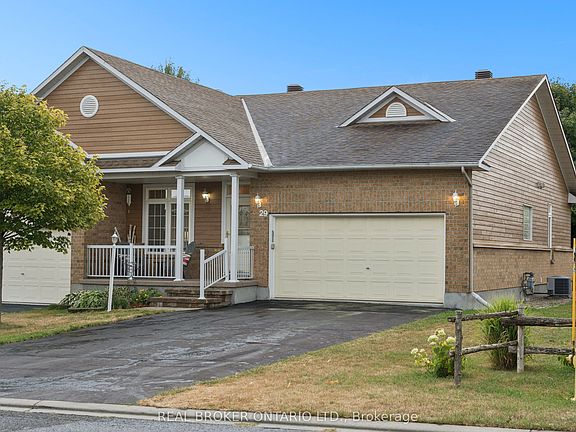 Welcome to 29 Sable Run Drive in Stittsville a spacious semi-detached bungalow in a sought-after, family-friendly neighbourhood. The main floor features well-defined living spaces, including a galley-style kitchen with a bright breakfast nook, a dining room that flows into the living room, and sliding doors that lead to a back deck with outdoor dining. The living room boasts a vaulted ceiling, crown moulding, and a cozy gas fireplace. Durable vinyl flooring and a tiled entry make maintenance easy. The primary suite offers a walk-in closet and ensuite with double vanity, soaker tub, and tiled shower, while a second bedroom and full bath complete this level. Convenient main floor laundry adds function. Downstairs, discover a large rec room, two additional bedrooms (one with a walk-in closet), and another full bathroom. Enjoy easy-care front and backyards, plus an attached two-car garage and private driveway. Perfect for downsizers or families seeking comfort and convenience in a welcoming community.