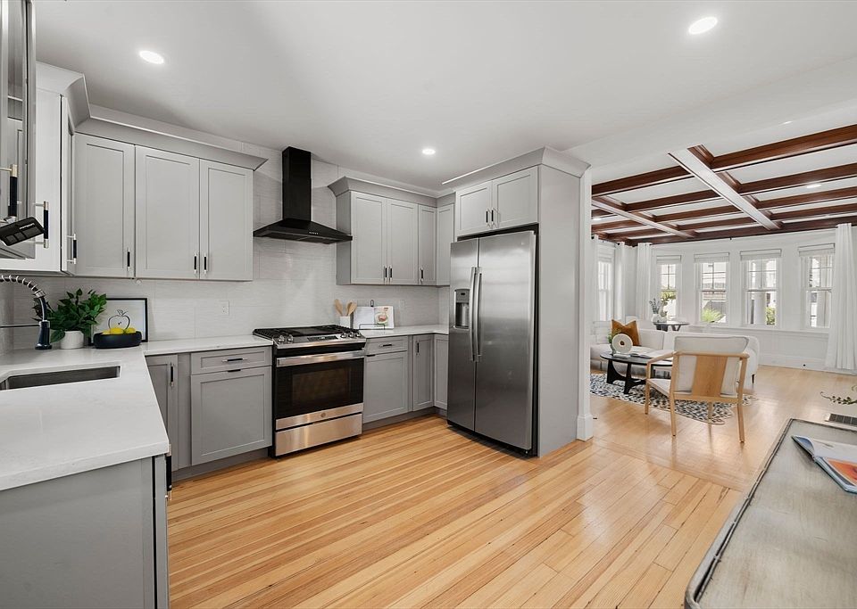With over 2,200sf of fully renovated living space, this 3+ bed, 2-bath duplex combines modern design, flexible layout, and exceptional convenience. Completely gut-renovated in 2022, the home offers ample room to live, work, and entertain in style. The open-concept main level is bathed in natural light and features an open kitchen with custom cabinetry, quartz countertops, and stainless steel appliances. It flows seamlessly into the living and dining area enhanced by coffered ceilings and hardwood floors. Two generously sized bedrooms on the main floor easily fit king-sized beds with room for additional furniture or workspaces. The fully finished lower level expands your living options with two versatile bonus bedrooms and a second living area, perfect for a home office, guest suite, gym, or media room. A large bathroom on this level includes a double vanity and walk-in shower. An oversized private deck off the kitchen leads directly to two parking spaces, including one garage.