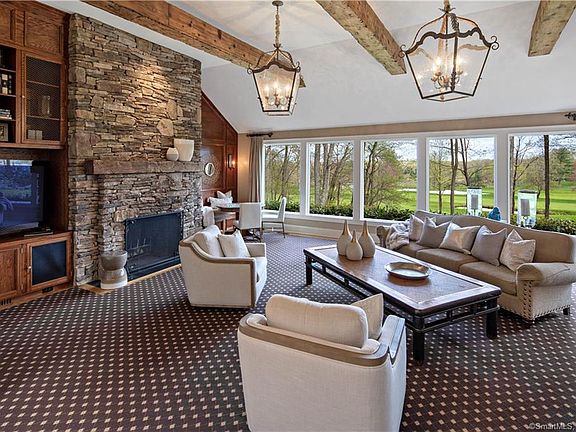 Easy living abounds at this extraordinary home situated on two beautiful acres at the end of a cul-de-sac. From the moment you walk through the front doors and step into the spacious living room with a gorgeous stone fireplace you will be captivated by the breathtaking panoramic golf course views, and it just keeps getting better from there. This 5,300+ sq. ft. contemporary colonial is built for family living with 5 bedrooms, including a luxurious first floor master suite with gas fireplace, 4 full baths/ 2 half baths, and a 3-car garage. Entertaining areas include an expansive open layout kitchen, equipped with the latest amenities leading to a family room with an oversized stone fireplace and built in cabinets. Enjoy an evening cookout on the large outdoor deck, with a firepit, while taking in the spectacular view of Aspetuck Valley Country Club's 2nd hole. An office / library, bright homework/play area off the kitchen and an oversized laundry / utility room complete the first floor. This lovely home boasts 3 levels of living, including an additional 1,200+ sq. ft. of finished lower level space, the perfect children's playroom oasis. The extraordinary setting offers an abundance of activities at arm's reach, including golf, tennis and pool at AVCC just steps away and hiking, biking, dog walking, and snowshoeing all within walking distance at Trout Brook Valley Trails. Private, Pristine, Spacious, Convenient...this unique home has it all! **Please view 3D walk through.