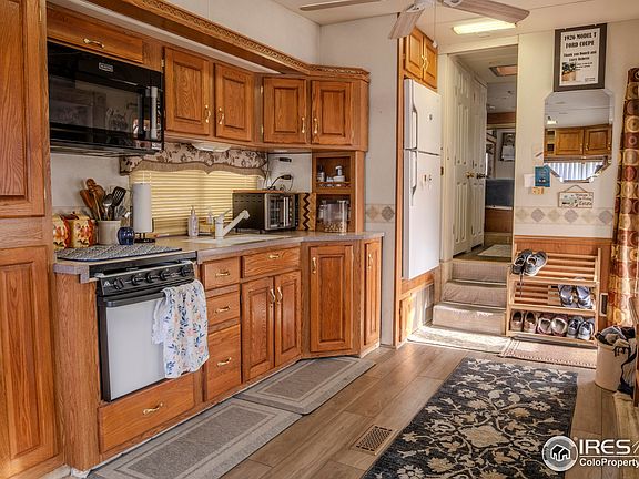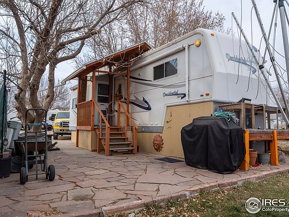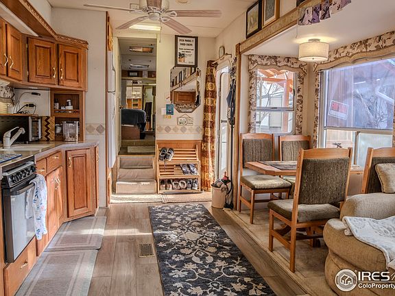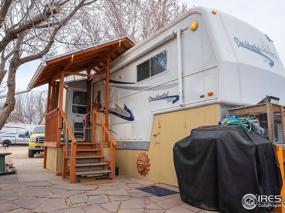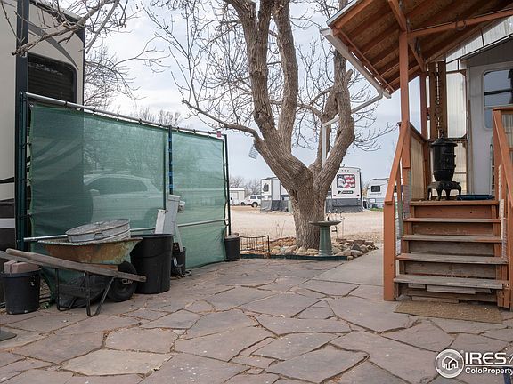 Impeccably Maintained RV in Year-Round 55+ Community in Erie. Conveniently located at County Line Road and Hwy 52, sitting on the Weld County side. Discover affordable, comfortable living in this beautifully cared-for RV. This home-on-wheels has been meticulously maintained inside and out, offering a clean, welcoming space that's truly move-in ready. Home can be moved, but is currently set up for year round comfort. You will love the full-sized refrigerator, the full size washer and dryer, new flooring, new roof, central a/c, gutters, the custom covered patio, and lots of storage space. The community is dog-friendly, making it a perfect fit for pet lovers looking for a simple, low-maintenance lifestyle. Lot rent is $600/month and covers your drinking water, irrigation water, sewer, trash and snow removal. The community includes a large lake stocked with fish, and allows fishing, paddleboarding and canoeing. Trails and private nature walks are enjoyed around the lake. Beautiful mountain views! This home is a 2003 model and has a full bathroom, full bedroom, open kitchen and living room. Whether you're downsizing, seeking a seasonal getaway, or wanting to stay close to family in the Erie, Boulder County, Weld County area, this RV offers comfort, convenience, and affordability in a prime location. No seller financing, must be 55 or older.