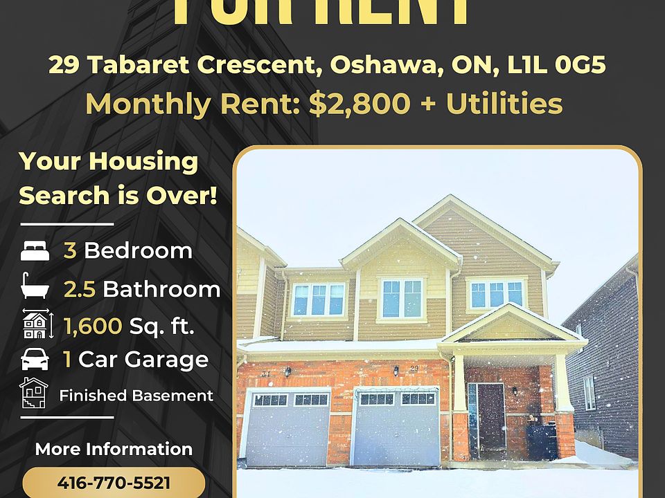 Address: 29 Tabaret Crescent, Oshawa, ON, L1L 0G5Monthly Rent: $2,800Available: January 1, 2026Square Feet: 1,600Size: 3 Bed | 2.5 BathProperty Type: Corner TownhouseBasement: FinishedParking: Included