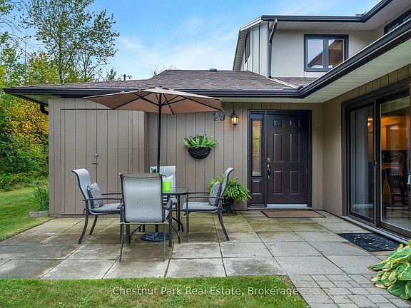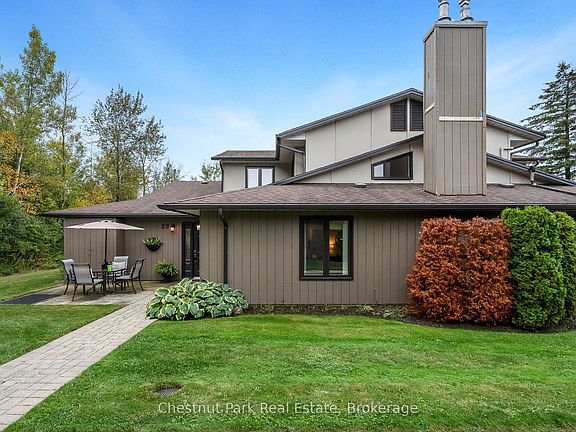 Peaceful forest backdrop, vaulted ceilings, and a fully renovated interior this 3-bedroom, 3-bathroom condo townhome at Whisper Woods delivers the best of Collingwood living. Located at the quiet end of the community and away from Highway 26, it offers rare privacy and a natural setting. The main floor features a bright and functional layout with a renovated kitchen, dining area, living room with soaring ceilings and gas fireplace, main-floor primary bedroom with ensuite, laundry, and powder room. Upstairs, a spacious bedroom/ loft overlooks the living area and another bedroom and full bath perfect for guests or family. Enjoy morning coffee or evening sunsets on your private patio with tranquil forest views. One dedicated parking space plus shared guest parking included. Carefree ownership with exterior maintenance, snow removal, and lawn care handled for you. Close to ski clubs, golf courses, Georgian Bay beaches, and Collingwood's shops and dining. Whether you're downsizing, retiring, or looking for a low-maintenance getaway, this home is a rare find.